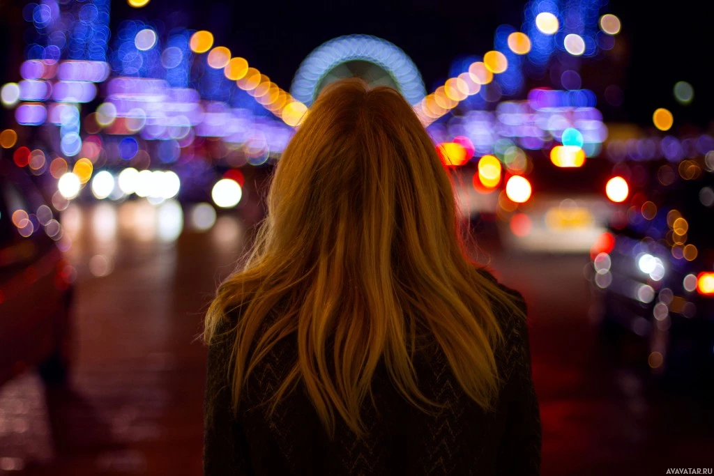 The picture features a woman standing on the side of a street at night. She is facing away from the camera, looking into the distance along the roadway which has traffic lights and illuminated signs adding to the urban ambiance. The environment suggests a city setting during nighttime hours with various colors of lighting contributing to the scene's atmosphere.