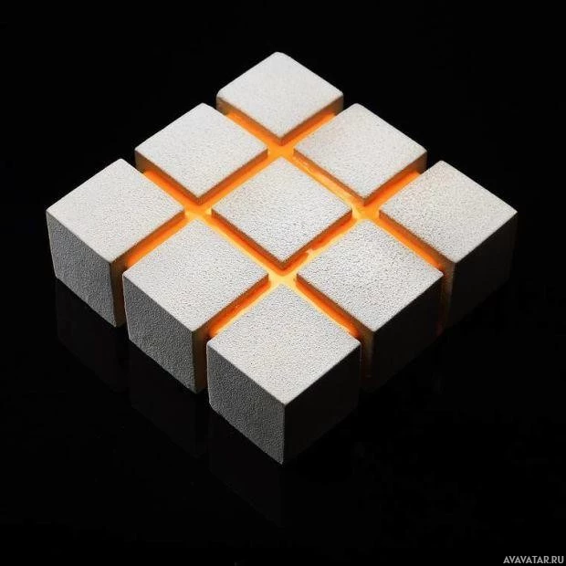 На снимке показан кубический объект с каждой стороны, состоящий из меньших квадратных и прямоугольных элементов. Эти маленькие кусочки окрашены в оттенки серого и оранжевого, создавая геометрический дизайн, который образует больший куб. Это пример того, что известно как модульный дизайн или куб головоломки, где отдельные компоненты могут быть собраны, чтобы сформировать различные формы или структуры.