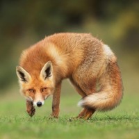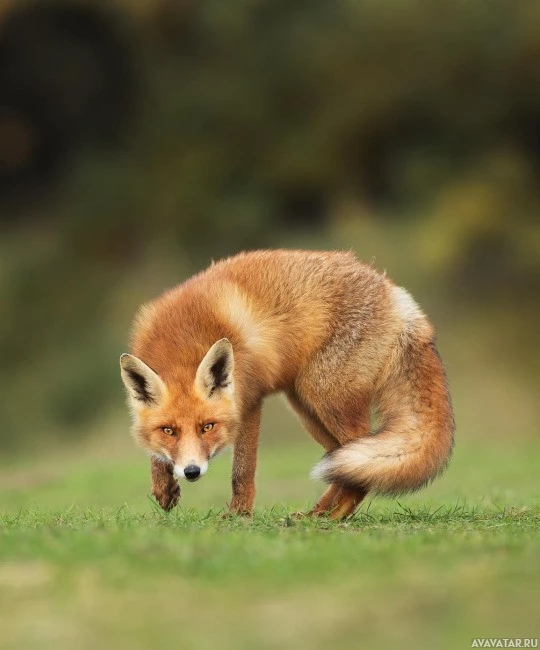 a red fox (Vulpes vulpes) standing on all fours with its front paws raised slightly above the ground. It appears to be in