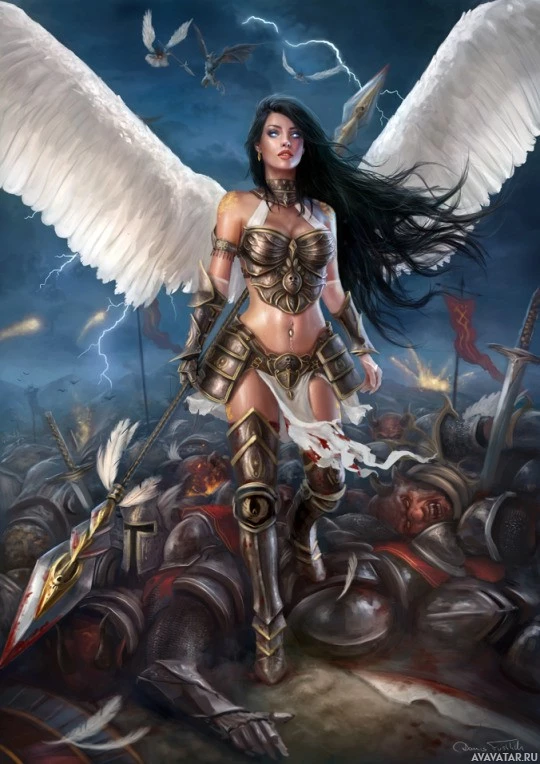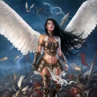 a female character with long dark hair and large wings, suggesting she might be an angel or a mythical being. She is wearing