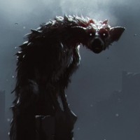 monstrous creature that looks like a hybrid between a wolf and a humanoid figure, standing on two legs with a menacing expression. In front of this creature is