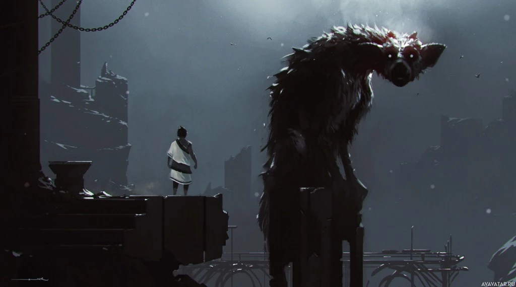 a human character who seems to be looking up at the creature with a concerned or fearful expression. The setting appears to be an outdoor, nighttime environment with ruins and snow-