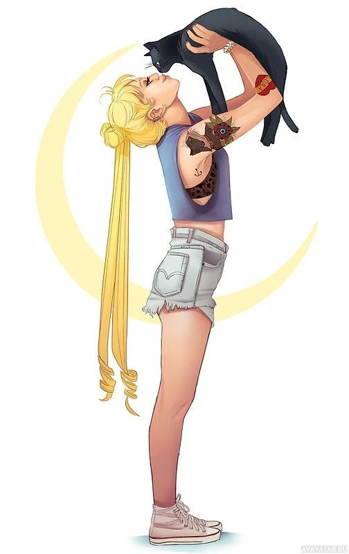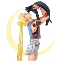 blonde hair styled into two buns with tails, similar to the hairstyle of Usagi Tsukino (Sailor Moon). The character is depicted holding up a cat, possibly in a caring or playful manner. The background includes