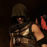 video game franchise. This individual is wearing a hooded outfit with leather-like materials and straps, along with what appears to be