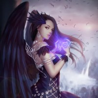 various creatures, suggesting she might be a chimera or a figure with a combination of mythical elements. She has wings like an angel, feathers on her arms, and what seems to be fur around her neck and