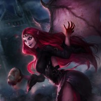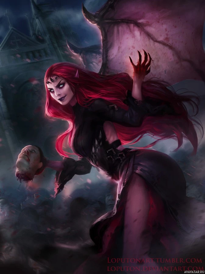 red hair and a menacing expression. She is dressed in dark, gothic attire that includes a long