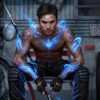 an energy blade, which could be part of his abilities within the context of the game or story. The character is shirtless and has visible tattoos on his arms and neck, suggesting a rugged or rebellious nature. His expression is serious and contemplative.