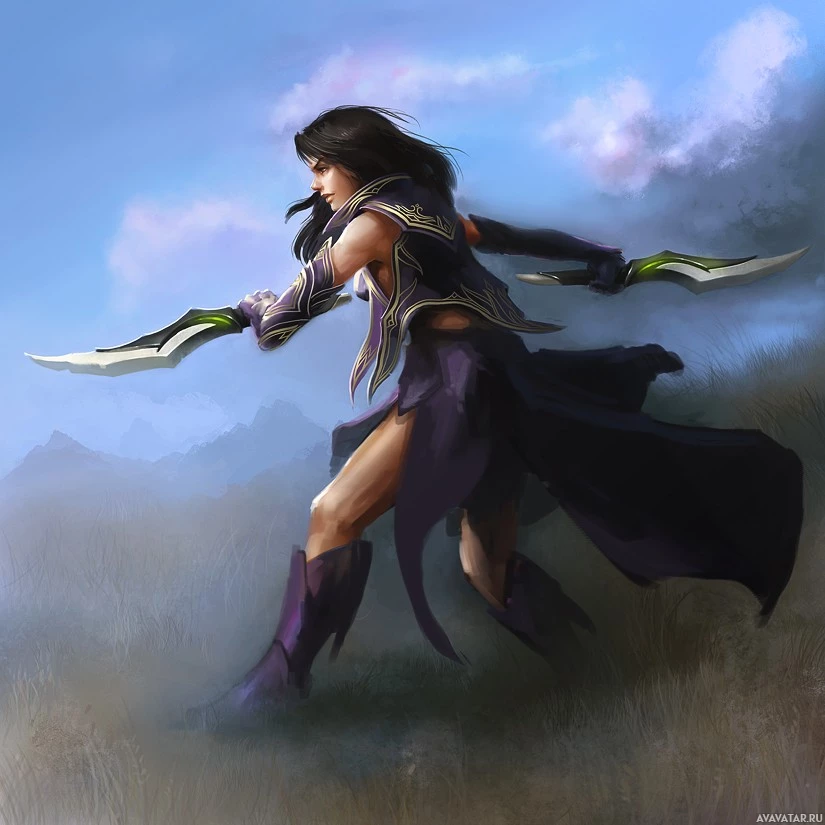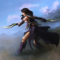 dark hair and is wearing a sleeveless top that appears to be designed for physical activity, possibly indicating she's involved in some sort of athletic endeavor or action scene. In her hands, she wields two curved swords, which could suggest she's engaged in combat or