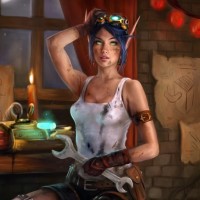the various tools, equipment, and bottles of substances around her. The character seems focused on something she's working with on the table, suggesting that she might be an inventor, alchemist, or someone involved in crafting or exploration within