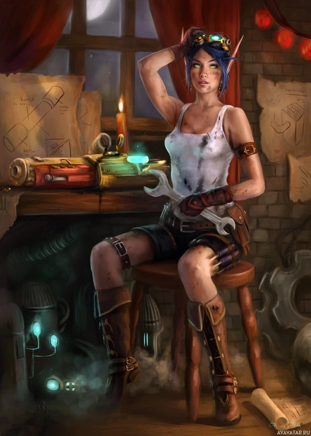 pointed ears and is wearing a helmet that looks like it could be for melee combat or adventuring. She is seated at a table in what appears to be a workshop or alchemist's room, as evidenced by
