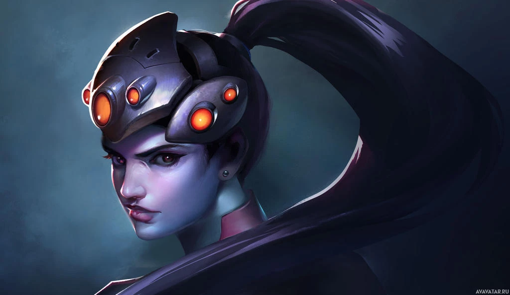 The image shows a digital artwork of Widowmaker, a character from