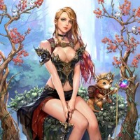 blonde hair. She is wearing a fantasy-style outfit that includes armor and boots, suggesting she may be from