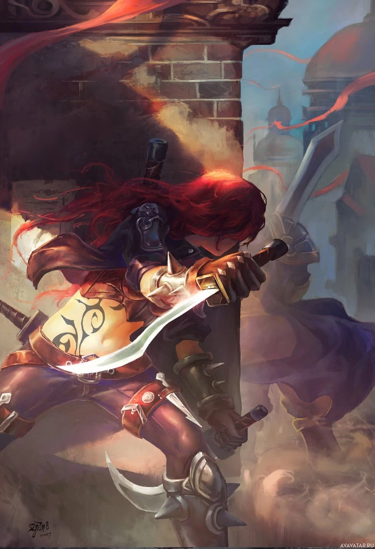 an action pose, holding a sword in her right hand and wielding another sword in her left. Her outfit appears to be armor, and she has