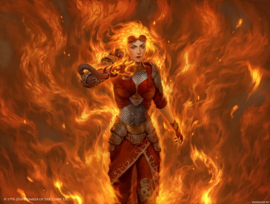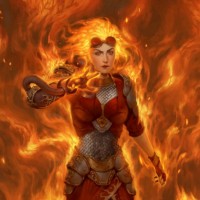 a female character in a fantasy setting. She is dressed in armor and holds what appears to be a flame or fire in her right hand, suggesting she may have powers related to fire. Her pose suggests she is either ready for combat or engaged in some sort of