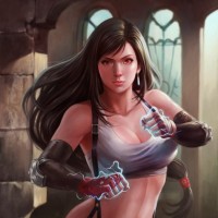 an action pose, holding her fists up and ready for battle. Her attire consists of what appears to be a tank top paired with shorts or pants that are not fully visible. In the background, there seems to be
