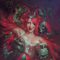 red hair surrounded by zombie-like creatures. She appears to be laughing or smiling, which contrasts with the ominous, horror-themed elements in the picture. There's also text that says "girl," "fantasy," and "red hair" visible in the image. The style of the artwork suggests it might belong to a fantasy or