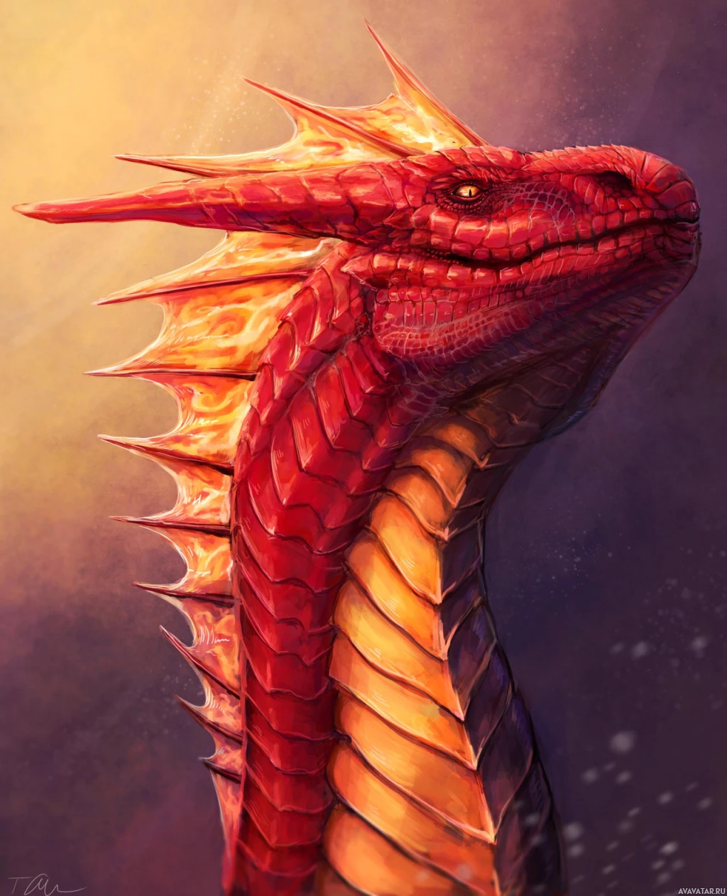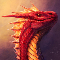red scales and prominent horns on its head. It is stylized in a way that suggests it might be from