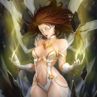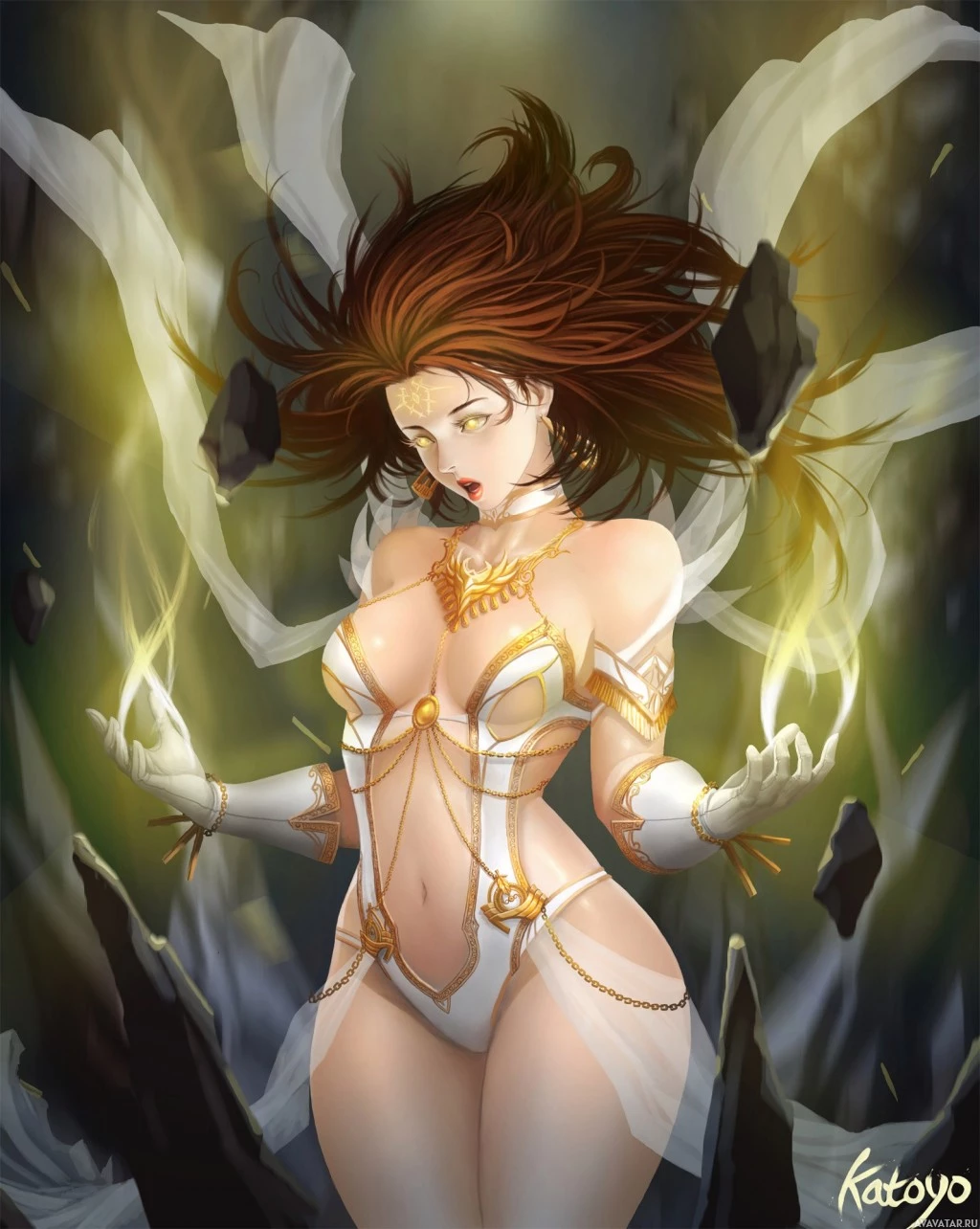 fantasy character with red hair. She is dressed in ornate, fantasy-themed armor and is holding a staff topped with