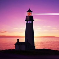The image depicts a picturesque lighthouse at sunset. The lighthouse is prominently located in the center of the frame, and its structure extends from the foreground into the background. The lighting of the scene suggests that it's either dawn or dusk, as indicated by