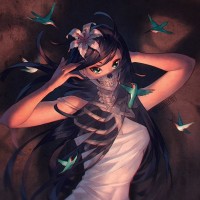 a young girl with brown hair. She has a somewhat ethereal or fantastical look, with detailed clothing and accessories that give her a distinctive appearance. The artwork is rich in color and texture, with the background showing hints of a dark, possibly