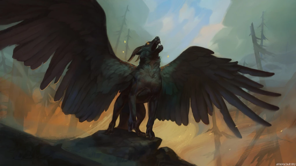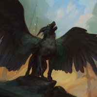 large wings, standing on a rocky outcropping. This character is humanoid in shape and has detailed