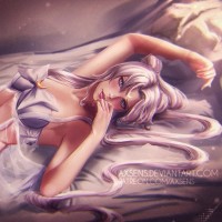 a serene environment, possibly at night given the darkness around her. The style of artwork is anime or manga-inspired, characterized by vibrant colors and detailed shading that gives depth to the image.
