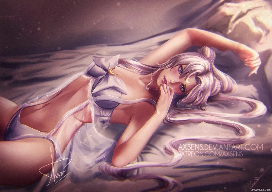 a female character with long white hair, wearing what appears to be a one-piece swimsuit. She is lying down on her stomach, resting her head on her hand and looking upwards with