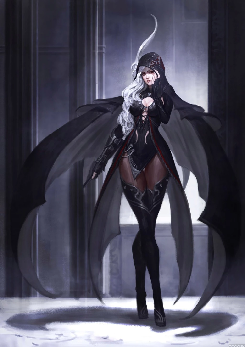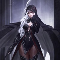 blonde hair. There are dark elements in her appearance, such as the hood and her expression which suggests she might be portraying a villainous or mysterious figure.