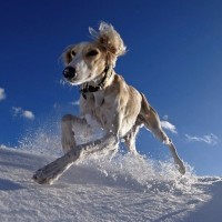 the light source being directly behind the camera. The dog seems to be enjoying its time outside and is captured mid-stride with one leg raised high in motion, indicating movement and energy.