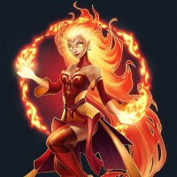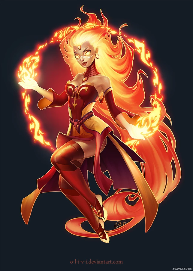 video game Dota 2. She is illustrated with an ethereal appearance, featuring flame-like hair and eyes that are glowing with