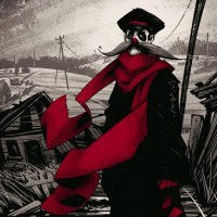 The image depicts a person wearing a red scarf and what appears to be a mask with a mustache or goatee. This character is set against a dramatic backdrop that suggests a war-torn or devastated landscape. The art style is reminiscent of comic book illustrations, giving the scene an intense, almost apocalyptic feel.