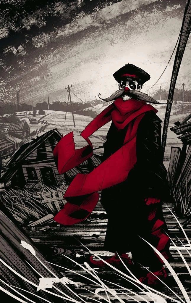 На картинке изображен человек, одетый в красный шарф и то, что кажется маской с усами или козой. Этот персонаж установлен на драматическом фоне, который предполагает раздираемый войной или опустошенный пейзаж. Художественный стиль напоминает иллюстрации к комиксам, придавая сцене интенсивный, почти апокалиптический вид.