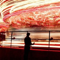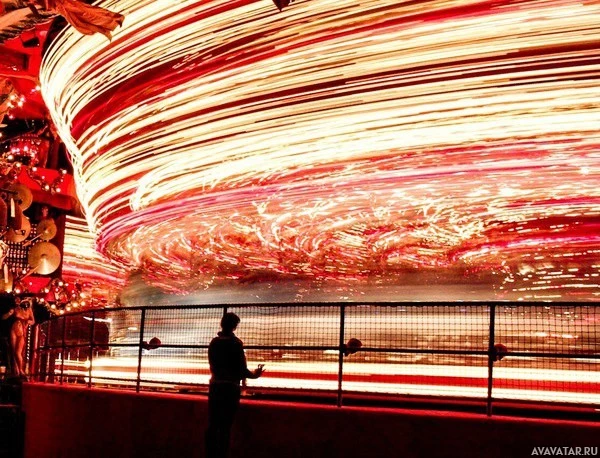 Картинка показывает силуэт человека, стоящего перед тем, что кажется большим ярким дисплеем. Этот дисплей напоминает карусель или колесо обозрения с красочными огнями, которые создают эффект полосатости. Кажется, что фотография была сделана сзади и ночью из-за темноты, видимой по краям изображения. Сцена захватывает художественный и динамический момент, когда размытые в движении огни на структуре создают абстрактный и визуально поразительный рисунок на темном фоне.