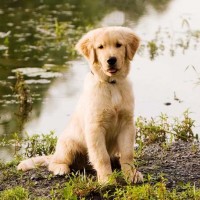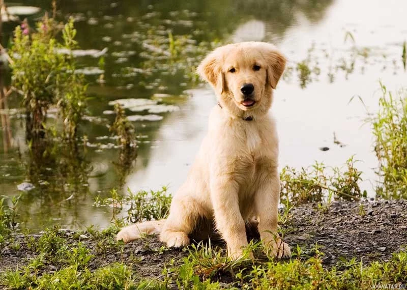 a golden retriever, which is a type of dog. The dog is sitting near what appears to be