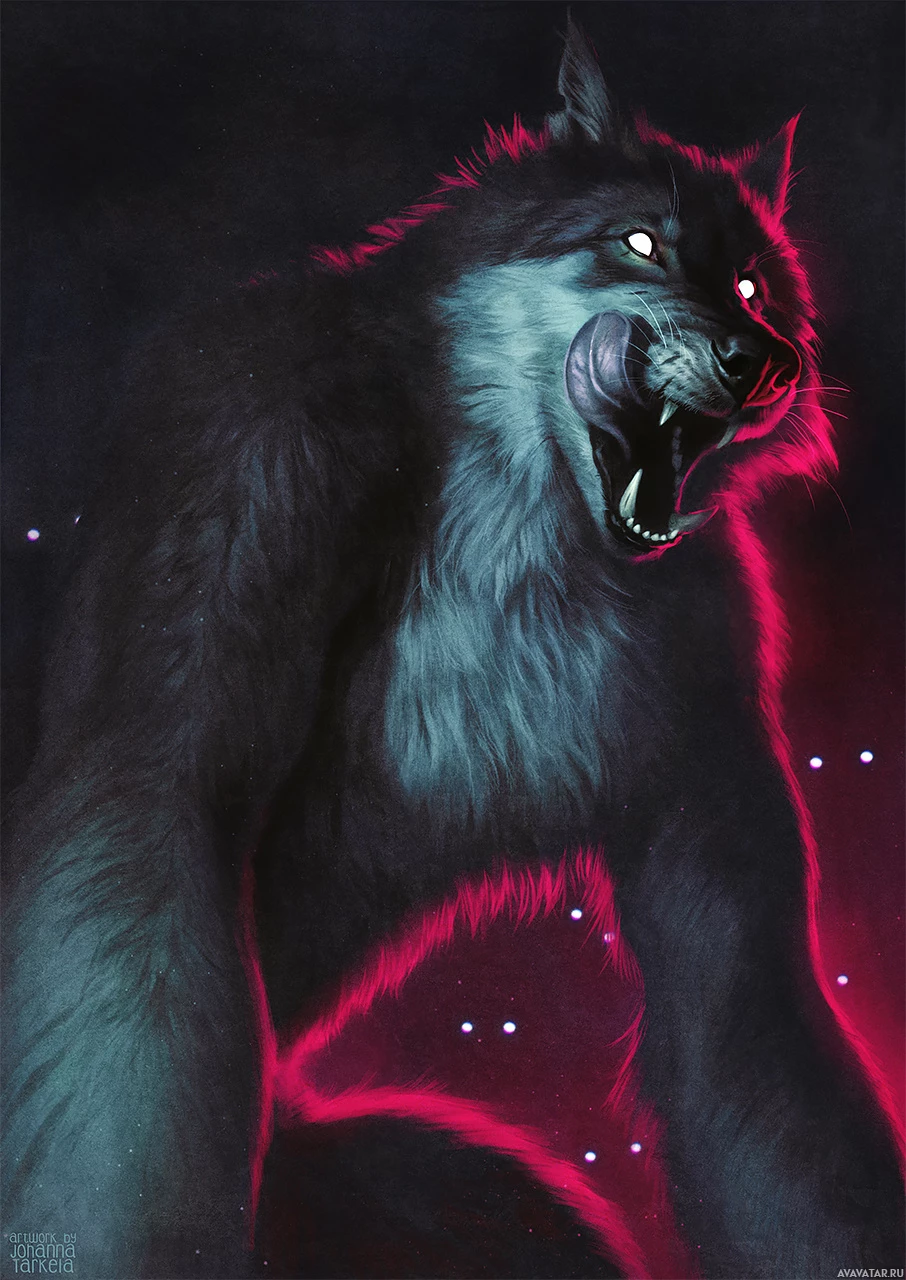 a dark background with a hint of reddish tones, which may suggest a supernatural or fantasy theme. The werewolf is shown in