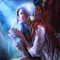 various accessories that give her an ethereal or fantasy-like appearance. Her expression is contemplative or possibly sad as she gazes downward towards what seems like