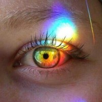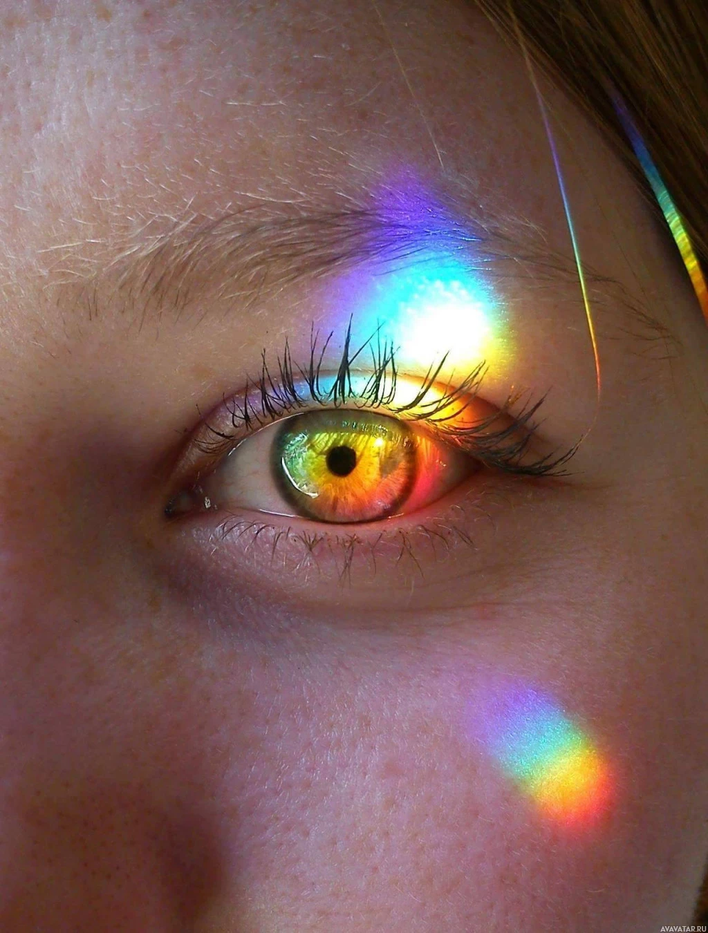 Изображение имеет глаз человека с отражением спектра радужного цвета. Глаз имеет необычный цвет, который может быть желтым или зеленоватым по тону, а отражение создает яркое отображение цветов, напоминающих радугу.