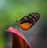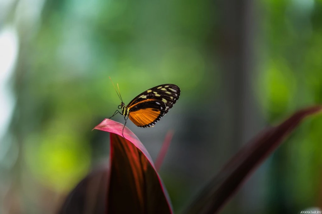 Картинка показывает бабочку, сидящую на листе растения. Фон размыт, предполагая, что это может быть внутренняя обстановка с зеленью или наружная площадка с листвой. Нет других объектов, которые можно уверенно идентифицировать из-за фокуса на бабочке и внефокусного фона.
