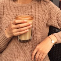 various accessories visible in the image, such as a watch on her wrist and possibly earrings. She seems to be enjoying her drink while sitting at an outdoor or indoor