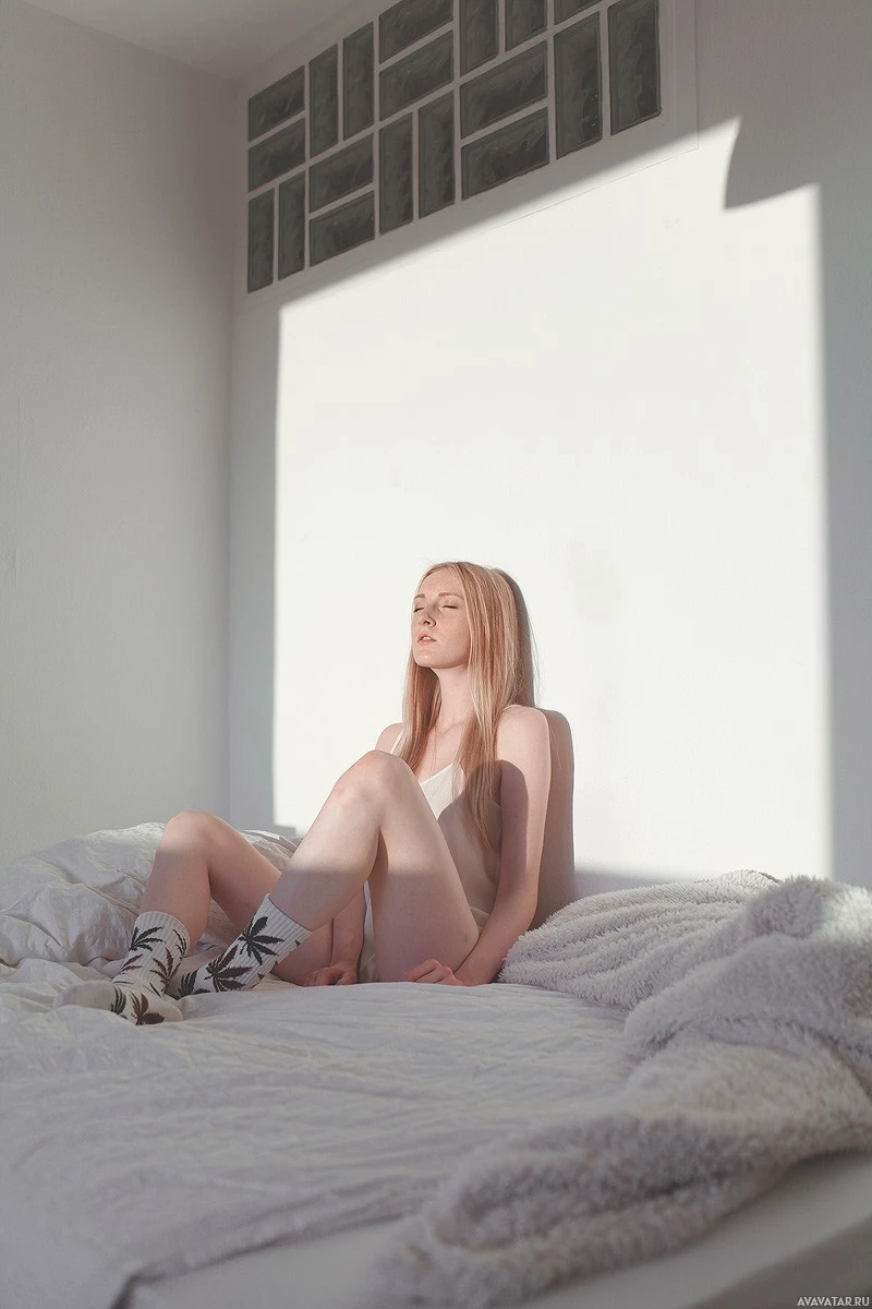 blonde hair and is wearing socks that appear to have a graphic or text on them. The sunlight is shining directly onto the side of the room, creating a bright,