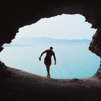 The image shows a silhouette of a man walking towards the sea, with an opening to a cave on the left side. The setting appears to be near water, possibly an ocean or a sea, and it looks like a coastal area.