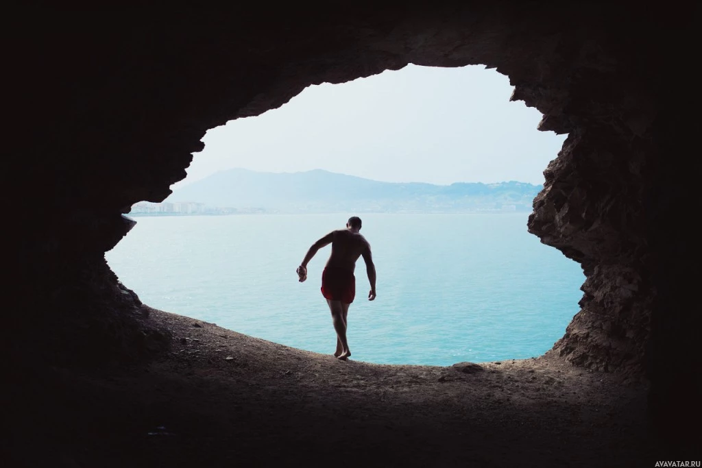 На изображении изображен силуэт человека, идущего к морю, с отверстием в пещеру с левой стороны. Расположение, кажется, рядом с водой, возможно, океаном или морем, и это похоже на прибрежную зону.