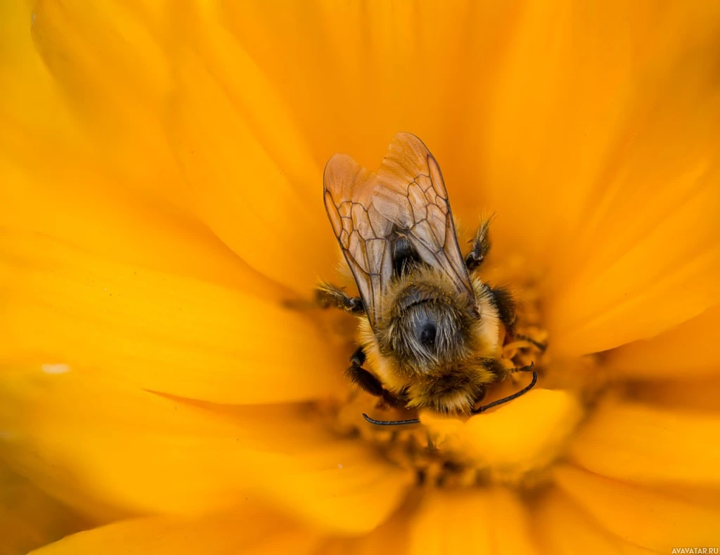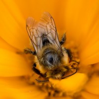 In the image, there is a bee (bumblebee) resting on top of