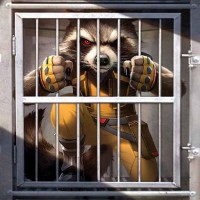 the Marvel Comics universe and known for his appearance in various movies such as "Guardians of the Galaxy." This character is shown inside what appears to be a cage, with other animal cages visible behind him. There's a spotlight effect on