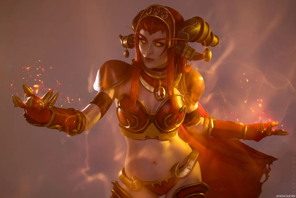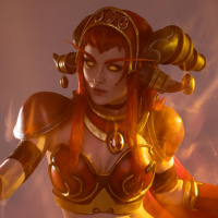 red hair, a horned headpiece, and is wearing armor with glowing accents. The background suggests she might be casting fire or energy from her hands, which adds to