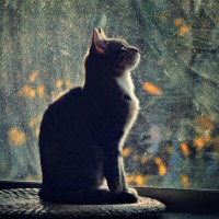 autumn leaves in the rain, which adds a seasonal touch to the scene. The cat's posture suggests curiosity or contentment as it gazes out the window.