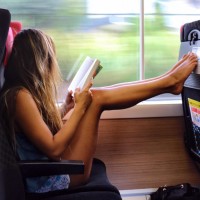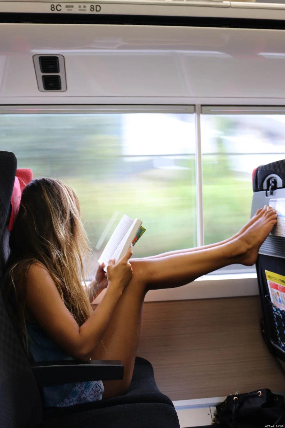 public transportation, reading a book. She is wearing shorts and appears to be relaxed, with one foot up as if she's resting or casually seated. There's a window next to her from which the scene outside is visible, suggesting that she might be traveling somewhere. The setting suggests a typical commute environment for