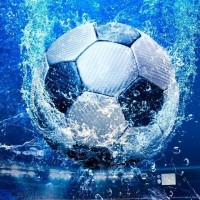 The image depicts a soccer ball emerging from water. This could symbolize a moment of triumph or victory in the sport, as soccer balls are often associated with goals and winning in soccer matches. The background shows what appears to be a stadium filled with spectators, adding to the celebratory atmosphere suggested by the image.