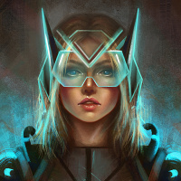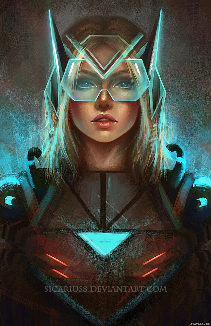 a glowing emblem or logo, which might be significant in the context of the story or setting she is from. She has glasses on her head and is gazing off into the distance, which gives her a focused and determined expression. The background has a textured appearance, enhancing