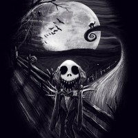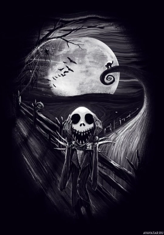 Halloween scene. In the foreground, there is a character that resembles Jack Skellington from "The Nightmare Before Christmas," standing on what appears to be a bridge or fence with